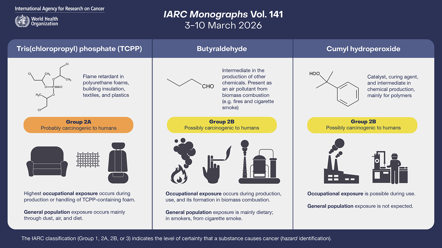 27The results of the recent IARC Monographs evaluation of three chemicals – tris(chloropropyl) phosphate (TCPP), butyraldehyde, and cumyl hydroperoxide – have now been published in The Lancet Oncology. The summary article presents the conclusions of IARC Monographs Meeting 141.
